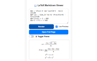 مشاهد LaTeX Markdown هو ملحق لمتصفح Chrome مصمم لعرض ملفات LaTeX وMarkdown بسلاسة. إنه يلبي احتياجات الطلاب والباحثين والمطورين الذين يحتاجون إلى أداة فعالة لعرض وتحرير الوثائق التقنية. يقدم الملحق عرض Markdown جميل، مما يسمح للمستخدمين بمعاينة الملفات على الفور مع مخرجات نظيفة ومنسقة. بالإضافة إلى ذلك، فإنه يدعم المعادلات الرياضية المعقدة من خلال MathJax، مما يتيح عرضًا قابلًا للتكبير من أجل وضوح معزز.